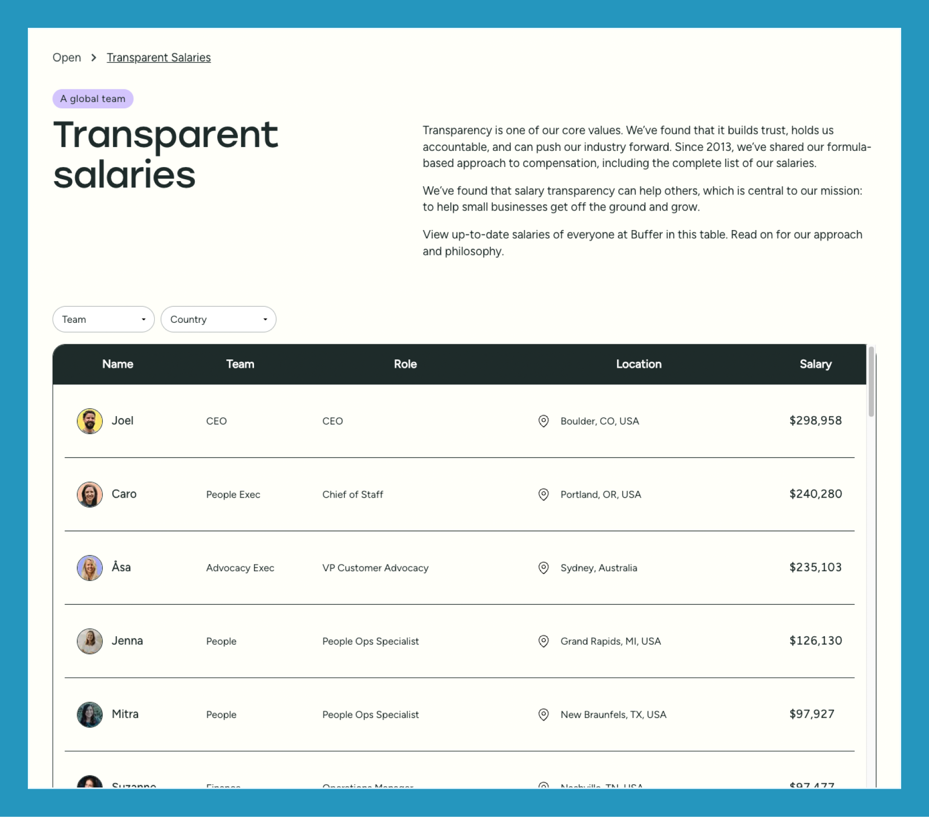 As well as the salary database, Buffer’s CEO Joel Gascoigne has also authored blog updates on how salaries at Buffer work and changes made throughout the years. Most recently, an update in January 2024 explains a new evolution of how each individual salary is determined.