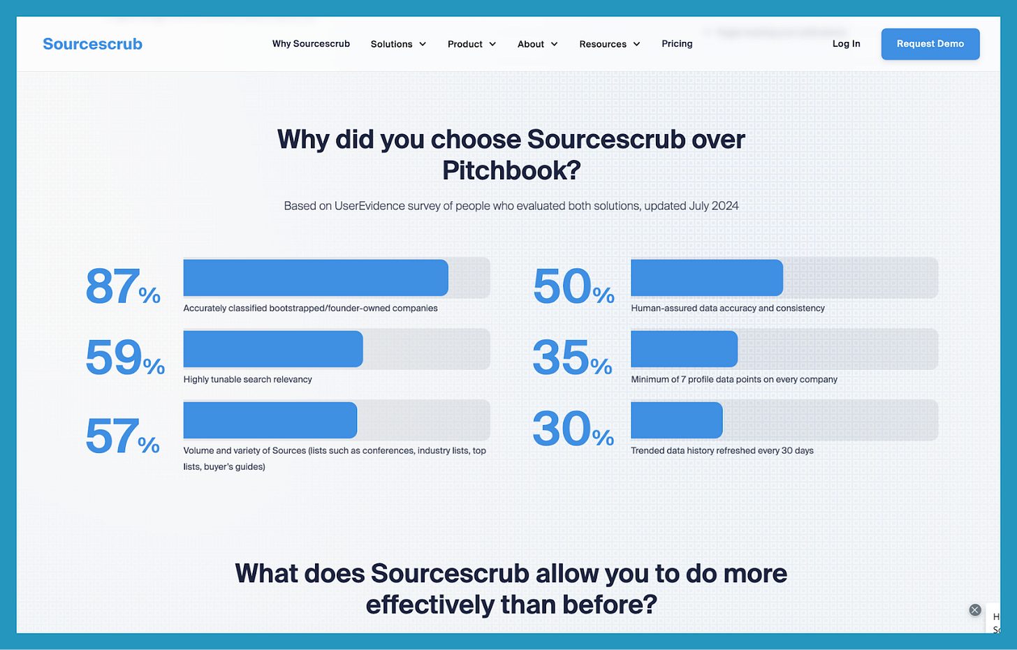 Deal sourcing platform Sourcescrub takes an approach that I haven’t come across before. Instead of subjective claims, they build their comparisons around user survey data – Sourcescrub vs Grata, Sourcescrub vs Pitchbook.