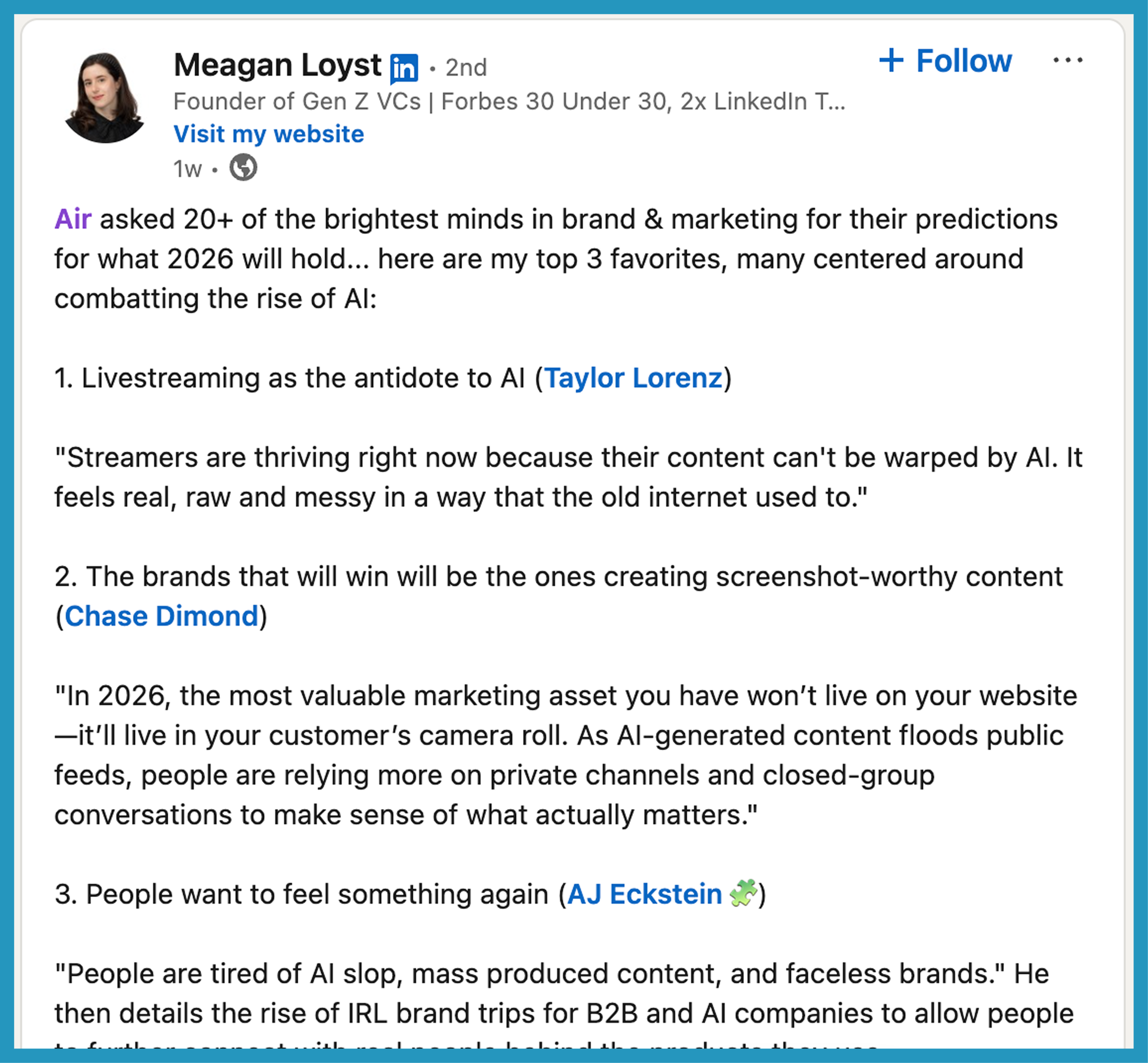 Take Meagan Loyst‘s post sharing her top 3 favourite predictions from the report – it’s an authentic reflection that doubles as distribution.