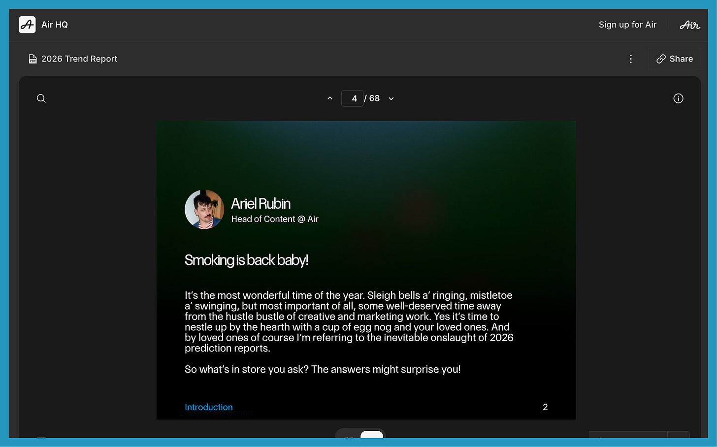 The introduction by Ariel Rubin (Head of Content at Air) lens into that self-awareness further: “It’s time to nestle up by the hearth with a cup of egg nog and your loved ones. And by loved ones of course I’m referring to the inevitable onslaught of 2026 prediction reports.”