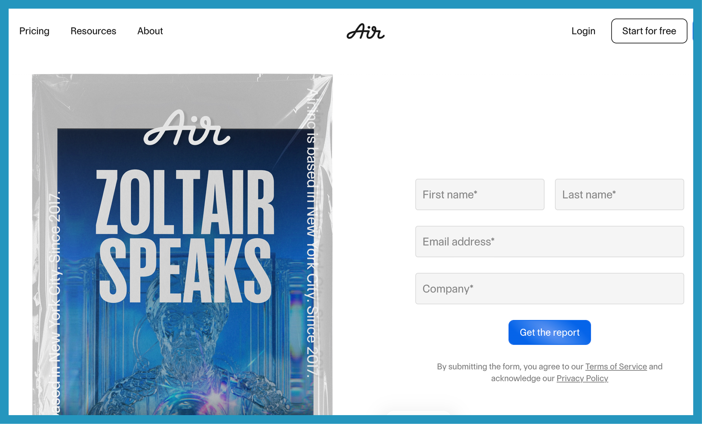 Product integration without the sales pitch. Delivering the report in-app gives users a taste of Air’s product while accessing content they want. It’s a subtle way to bring product education into educational content – showing what Air does without making the report about Air. Brands often struggle to bridge top-of-funnel brand content and bottom-of-funnel product content, but Air threads that needle naturally.