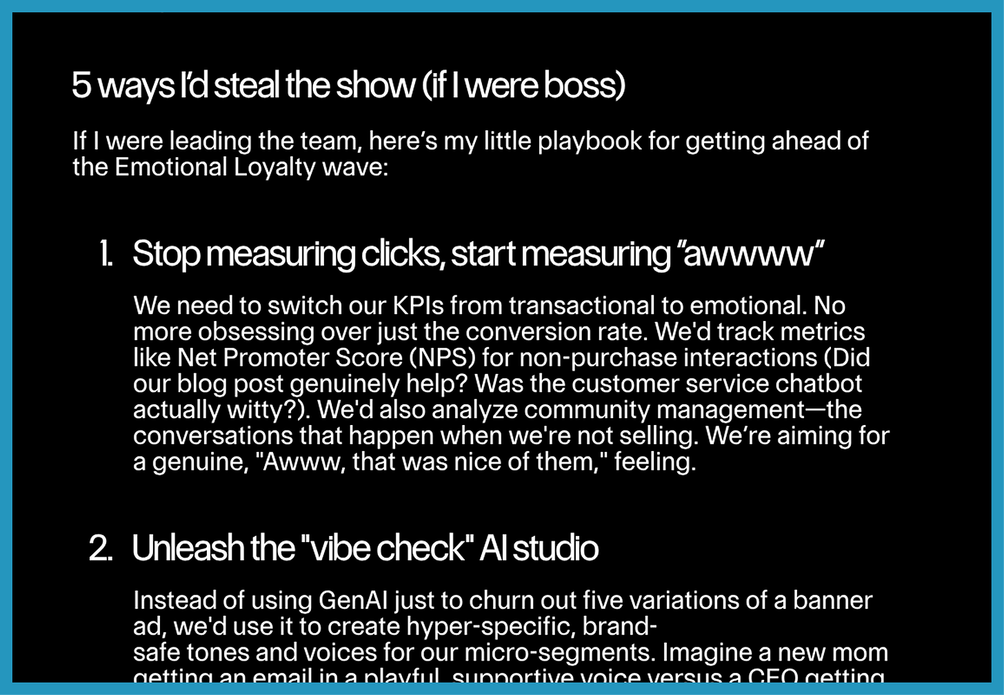 Format makes it actually readable. Most predictions reports are dense, data-heavy documents that get skimmed once and forgotten. Air’s approach – one prediction per person, actionable advice, clear formatting – makes it something you’d actually read through. Yes, it’s still a gated PDF (this is my one criticism, personally, I do think this could’ve worked brilliantly as a blog series or even just social posts), but the bite-sized format and space given to each contributor makes it feel more like genuine thought leadership than a list of crowdsourced trends.